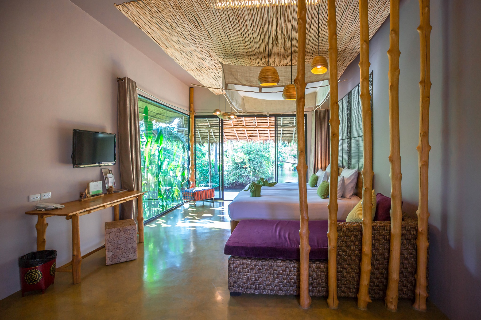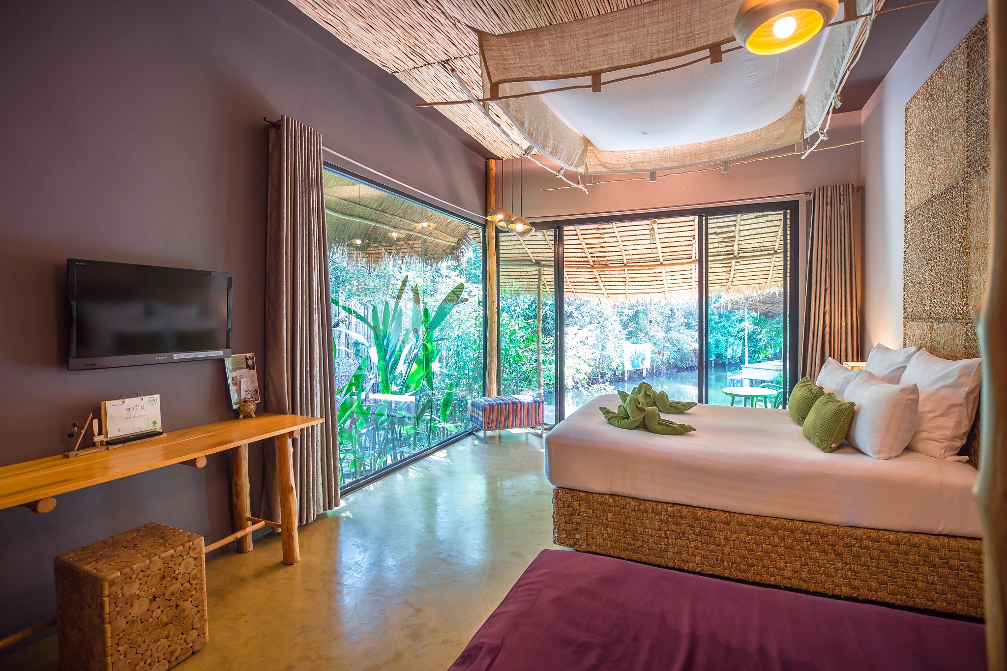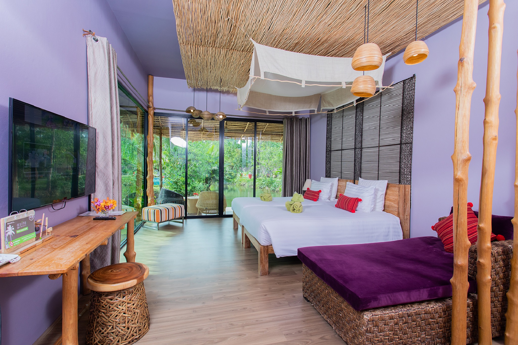 Villas Deluxe is 42 m2 with an additional space for an outdoor garden for the ultimate relaxation. Interior is fully furnished with twin or queen bed, working table and cozy sofa bed, with an emphasis on space and comfort; decorations and fixtures are derived from local natural products to help preserve the environment. Each room has a view of green trees, spacious bathroom with separate shower and balcony with direct access to the private swimming pool (canal).