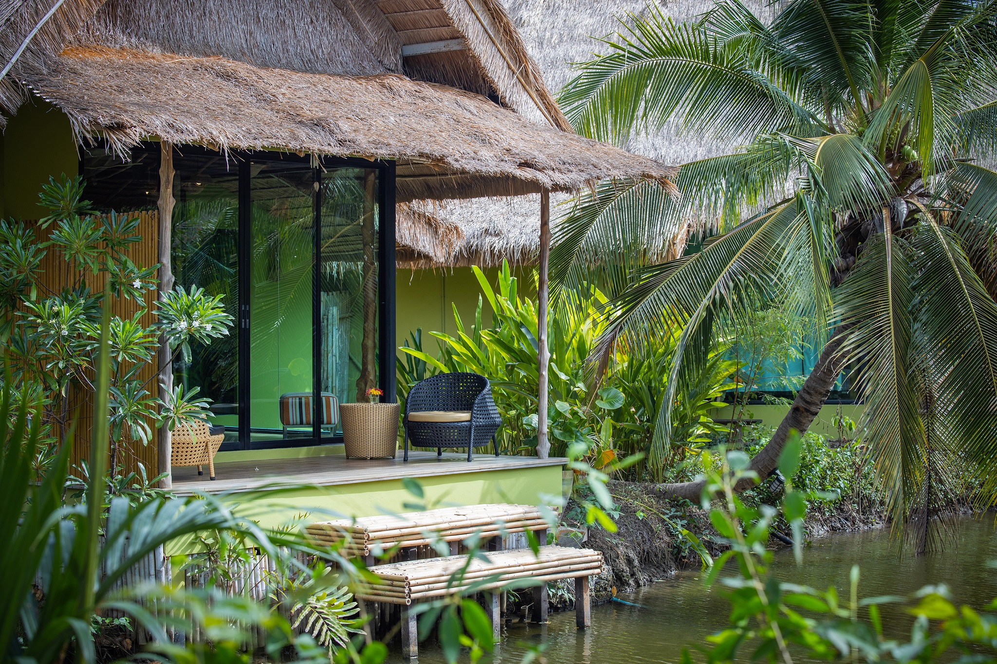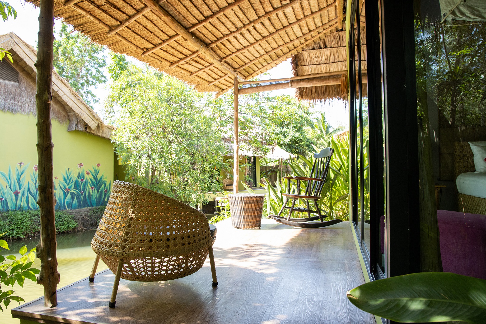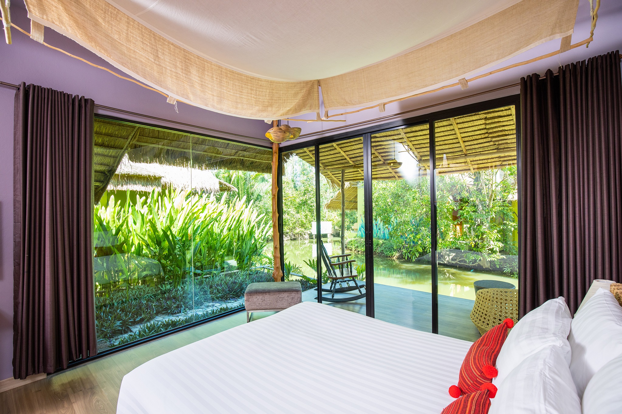 Villas Deluxe is 42 m2 with an additional space for an outdoor garden for the ultimate relaxation. Interior is fully furnished with twin or queen bed, working table and cozy sofa bed, with an emphasis on space and comfort; decorations and fixtures are derived from local natural products to help preserve the environment. Each room has a view of green trees, spacious bathroom with separate shower and balcony with direct access to the private swimming pool (canal).